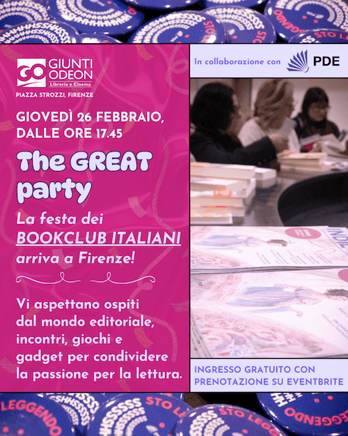 Arriva a Firenze, da Giunti Odeon - Libreria e Cinema, The Great Party, la festa itinerante dei gruppi di lettura italiani nata dal censimento The Great Survey, il grande progetto PDE che ha mappato oltre 1000 gruppi di lettura in Italia.